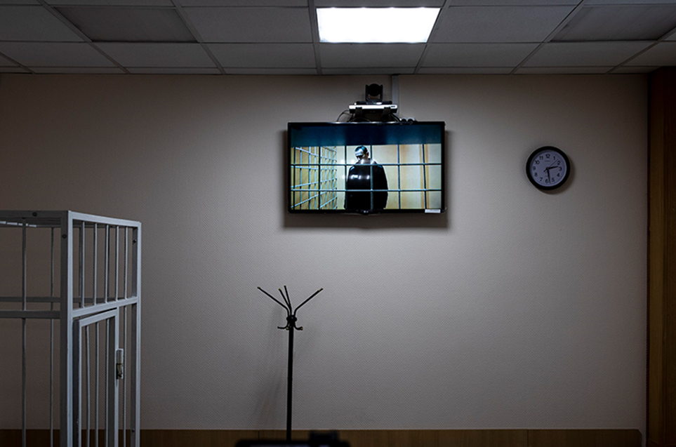 В июне Алексея перевели обратно в ИК-2 — качество трансляции стало получше, а в кадр на его стороне еще и попадала решетка. Но теперь заседания проводили в Москве, а столичные суды до сих пор были закрыты для фотографов под предлогом коронавируса. Прошло лето, в середине осени я решил уезжать, потом начал снимать Дашу — и тут заседание в Петушках наконец-то назначили на 9 декабря. Главного российского политзаключенного полгода никто не видел даже на экране, и ажиотаж слишком сузил мою фантазию: я взял только длиннофокусные объективы, рассчитывая все выделенное время крупным планом снимать телевизор.