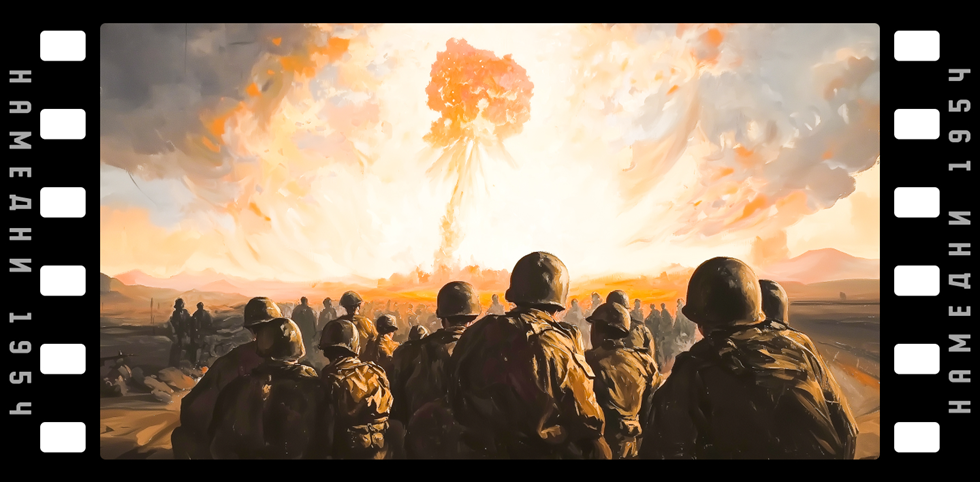 Советские атомные бомбы (см. 1949) до сих пор взрывали только на испытаниях. А надо бы применить их страшный заряд «в условиях, максимально приближенных к боевым». Задача учений на Тоцком полигоне – «прорыв подготовленной тактической обороны противника с применением ядерного оружия». По сценарию, «восточные» (советская армия) сбрасывают на позиции полковых резервов «западных» (войска НАТО) атомную бомбу РДС-2 мощностью 40 килотонн. Самолет-носитель Ту-4 выпускает ее с высоты 8 тыс. м, взрыв происходит в 350 м от земли. Внизу наземные взрывы имитируют бочки с бензином. Пять минут развивается штатная картина ядерного удара: ослепительная вспышка, огромное облако, пылевой столб. Потом начинаются артподготовка и авиабомбардировка. После них через район ядерного поражения идут в наступление войска «восточных».