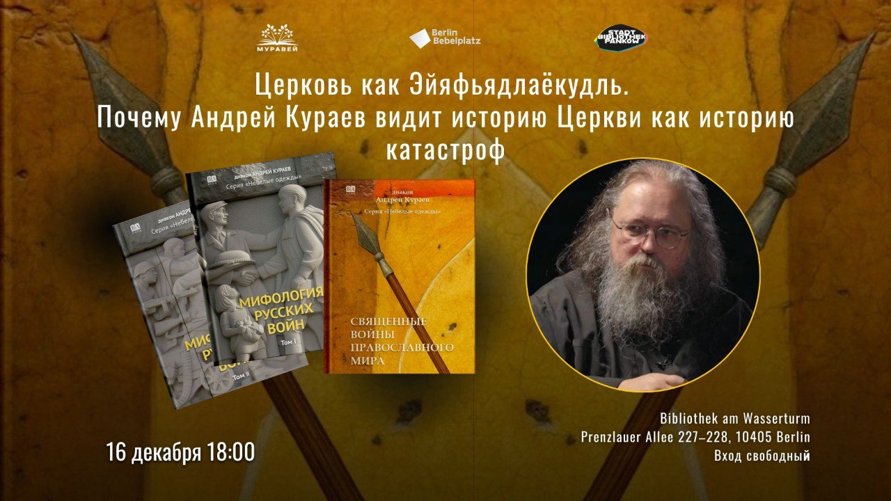 Если вы, также как мы, ничего не поняли из названия этой статьи и собираетесь, волею случая, быть в Берлине 16 декабря, обязательно приходите на встречу с нашим замечательным автором, диаконом Андреем Кураевым, которая состоится в указанную дату по адресу: Bibliothek am Wasserturm, Prenzlauer Allee 227–228, 10405 Berlin. Вход свободный!