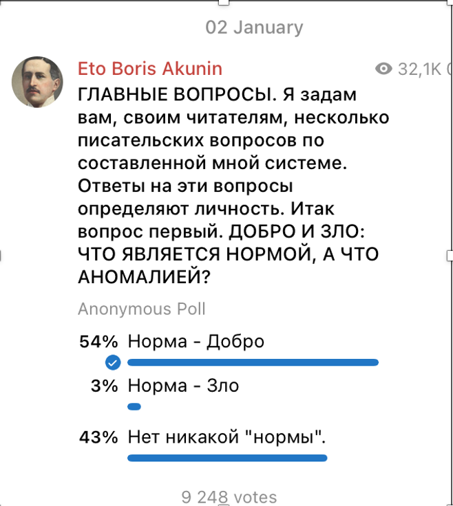 Весь январь я изучал свою аудиторию. Задал ей десять «главных вопросов», используя для этого фейсбук и телеграм. Первый дает возможность более или менее развернутого высказывания, второй имеет функцию голосования.