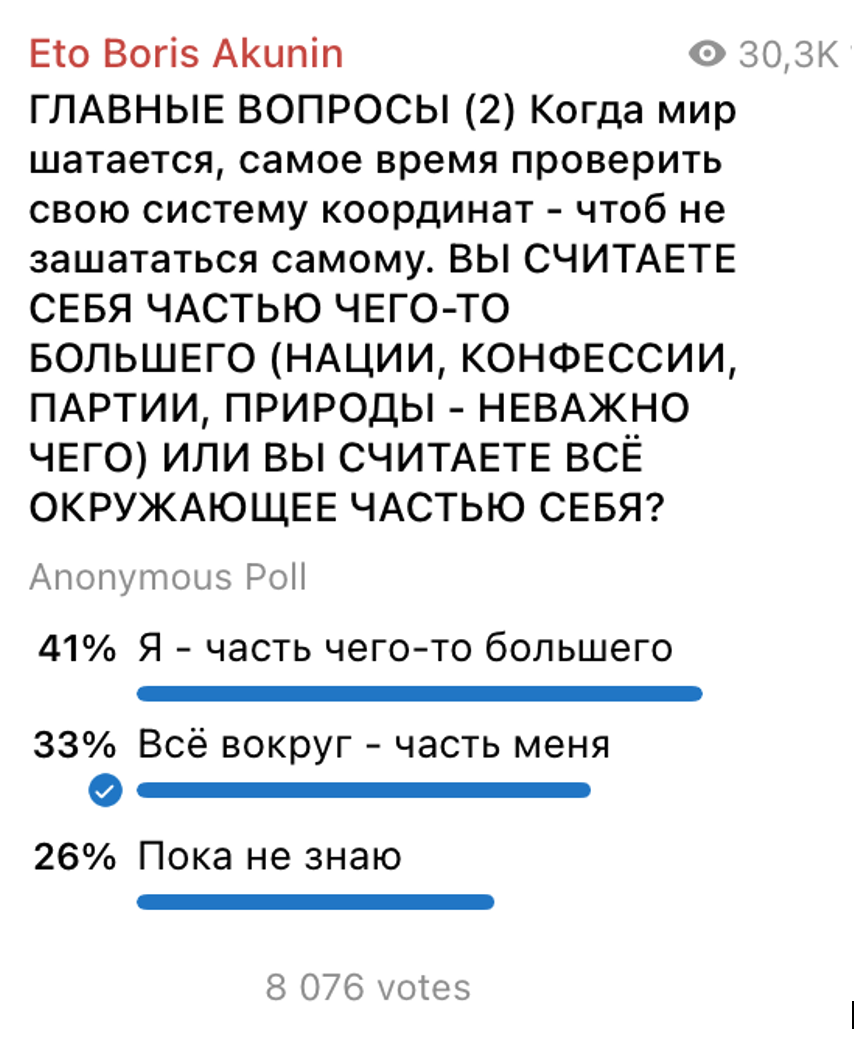 Это тоже весьма нетипичный результат для нынешней ситуации – военной, делящей людей на лагеря. Ведь большинство моих читателей живет в России, Украине, Израиле, где все очень политизированы. В такие времена людям естественней ощущать себя не одиночками, а частью чего-то большого. Треть индивидуалистов – это аномально много.